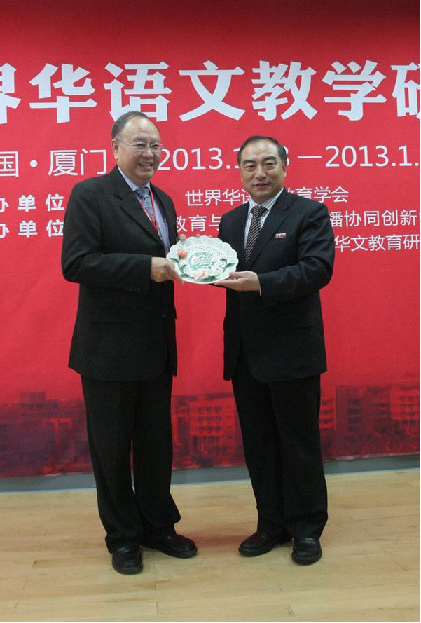 贾益民代表华侨大学向程万里等人赠送纪念品