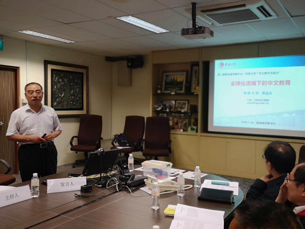 新加坡华文教研中心院长符传丰、副院长张龙晋、前任院长陈之权,华侨大学前任校长贾益民教授、华文教育研究院副院长胡建刚、华文学院副院长沈玲等嘉宾出席了开幕式。开幕式由新加坡华文教研中心研究组长林进展博士主持。符传丰院长介绍了新加坡华文教研中心的目标、开展的华文教研工作。他特别指出,今年正值新加坡华文教研中心十周年庆,迎来华侨大学交流团的回访,是十分有意义的事情。贾益民教授在交流会上作了《全球化语境下的华文教育》主旨报告。贾益民深入阐释了“全球化”概念,分析了全球化语境给华文教育发展带来的新机遇,提出要树立华文教育全球化发展理念,充分认识华文教育全球化发展的必然性及其现实意义,致力于建立“全球华文教育责任共同体”,推动形成全球化的“大华文教育”格局,促使华文教育融入全球化发展主流。