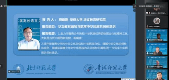 2022年11月19日,第二届高校语言文字工作论坛成功举行。教育部副部长、国家语委主任田学军,教育部语言文字应用管理司司长周为,青海省教育厅厅长、省语委副主任申红兴,北京师范大学校长马骏,青海师范大学党委书记毛学荣出席论坛开幕式。论坛开幕式由北京师范大学副校长康震主持。 我校国家语言文字推广基地副主任委员、华文教育研究院胡建刚副院长参加论坛并作发言。