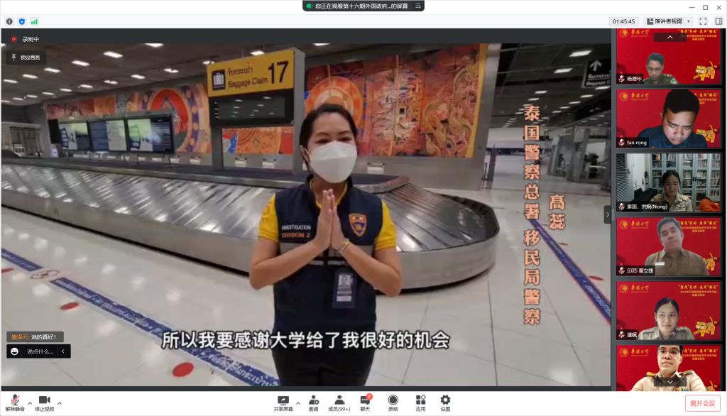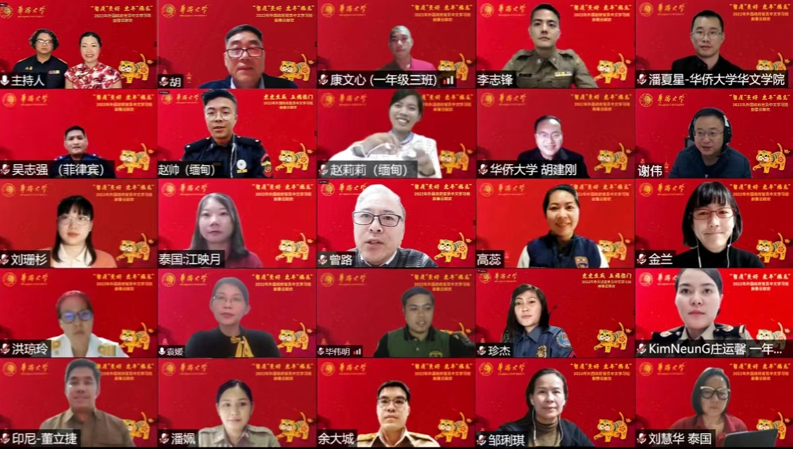 1月27日晚,华侨大学第十六期外国政府官员中文学习班举办云端联欢晚会,共庆中国年。来自泰国、缅甸、老挝、印度尼西亚、菲律宾5个国家的全体学员及部分老生代表参加。